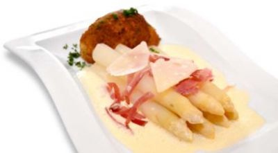 Bélgica - Huevos fritos, espárragos y sabayón de cerveza Virutas de queso de leche cruda de vaca y jamón OEufs frits, asperges et sabayon à la bière, copeaux de fromage de vache au lait cru et jambon
